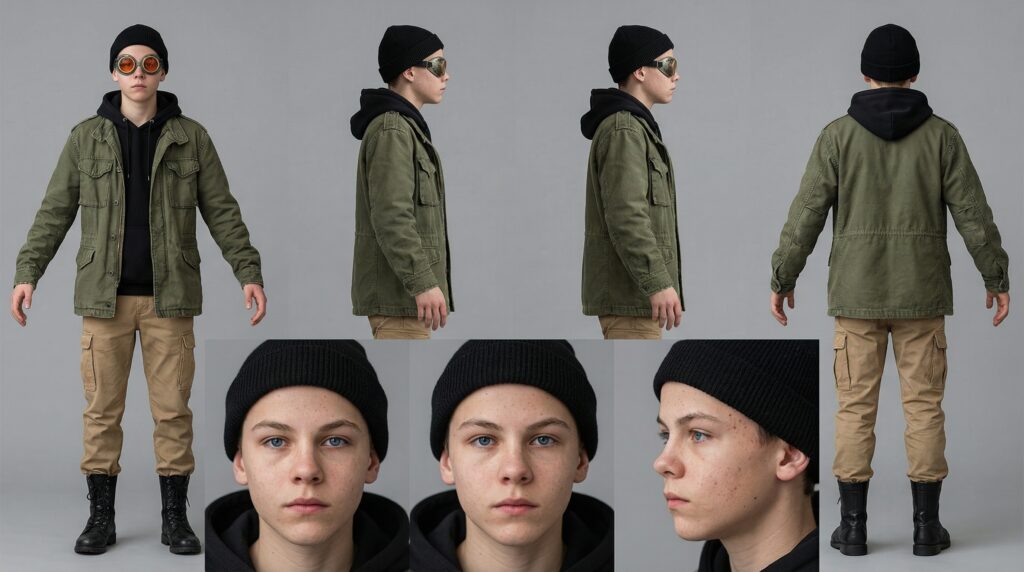 Create a professional character reference sheet of a cyberpunk boy based on the provided reference image. Match the exact visual style, realism level, rendering approach, texture, and color treatment of the reference. The character has deep clear blue eyes and wears a black beanie, slightly worn round orange goggles, a faded olive green military jacket with visible creases and subtle wear, layered over a black hoodie, khaki cargo pants, and black military boots.