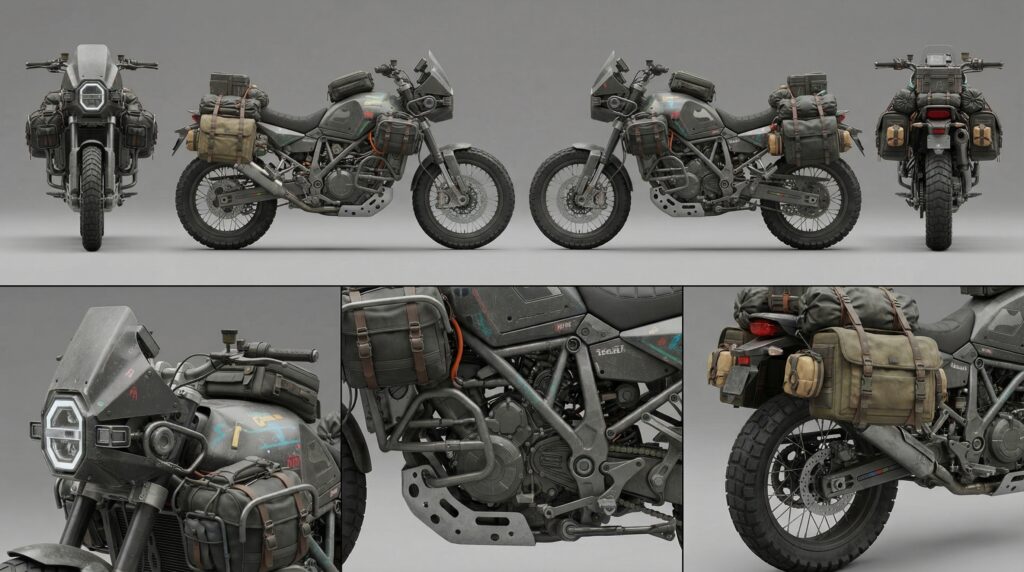 Create a professional vehicle reference sheet of a cyberpunk nomad-style off-road motorcycle based on the provided reference image. Match the exact visual style, realism level, rendering approach, texture, and color treatment of the reference.