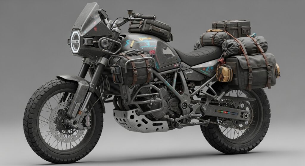 realistic off-road motorcycle with a cyberpunk nomad style, rugged and heavily modified, matte black and worn metal body with subtle colorful accents, dust and scratches, utility-focused design, equipped with storage packs, side bags, and strapped gear, exposed mechanical parts, reinforced frame, thick off-road tires, minimal futuristic elements blended with practical survival design, soft natural lighting, neutral gray background, simple studio backdrop, realistic photography, 50mm lens, shallow depth of field