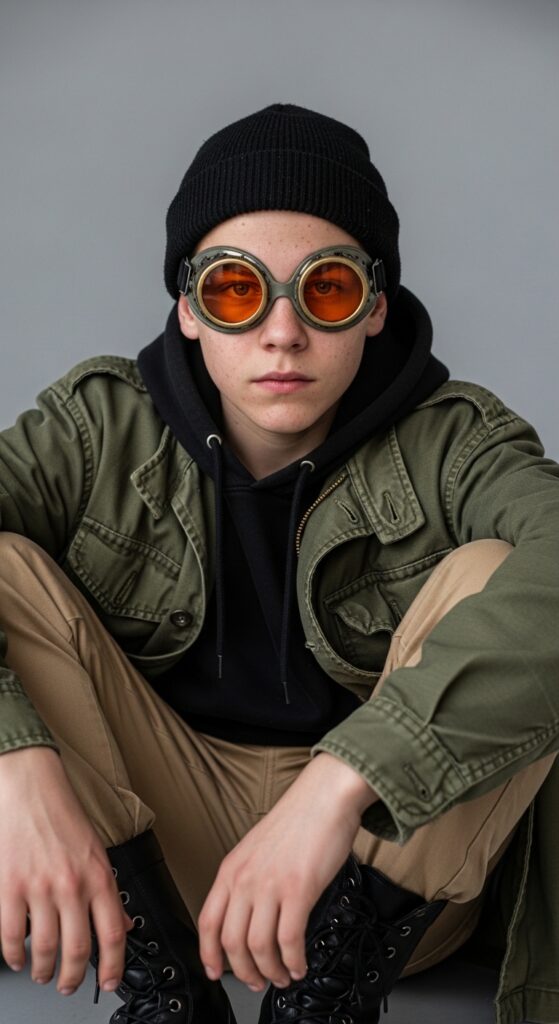realistic candid photo of a cyberpunk boy, wearing a black beanie, deep clear blue eyes, wearing slightly worn round orange goggles, faded olive green military jacket with visible creases and fabric texture, layered over a black hoodie, khaki cargo pants, black military boots, natural skin texture with pores, slight blemishes, subtle dark circles under eyes, relaxed neutral expression, imperfect posture, soft natural lighting, gray background, minimal simple backdrop, shot on 50mm lens, shallow depth of field, documentary photography style